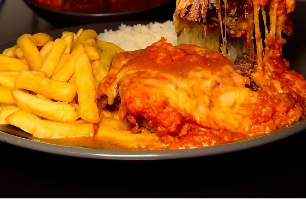 Porção com 150g de costela defumada coberta por molho caseiro com aroma de manjericão. Acompanha: Arroz, fritas individual.